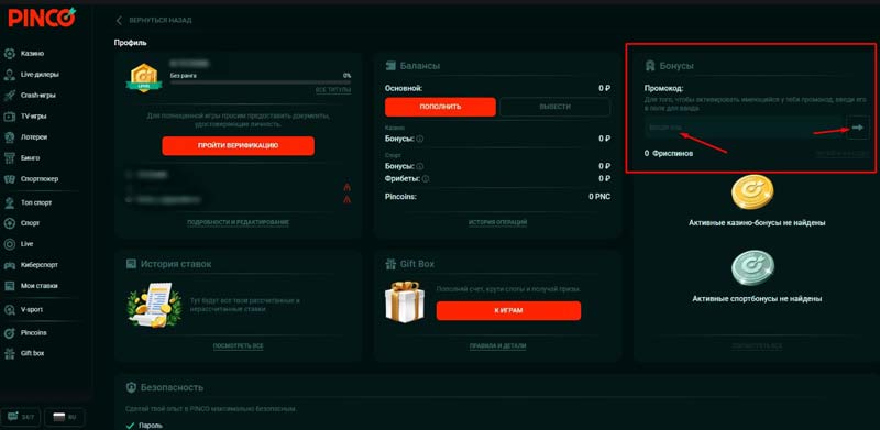 На главной странице профиля отображается информация об аккаунте. Можно узнать о состоянии всех счетов, посмотреть начисленные бонусы и историю ставок. В правом верхнем углу размещено поле для применения промокода.